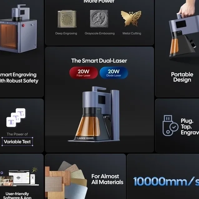 2024 Laserhawk LH5 Diode Laser Engraver with high-precision cutting and engraving capabilities: Ideal for industrial prototyping and artistic design. Achieves 1000mm/s speed with ±0.05mm accuracy + 3-year warranty. Enhanced durability and versatility for professionals. Streamlines production workflows for manufacturers, craftsmen, and artists. ISO 9001 & CE Certified. Worldwide shipping available.