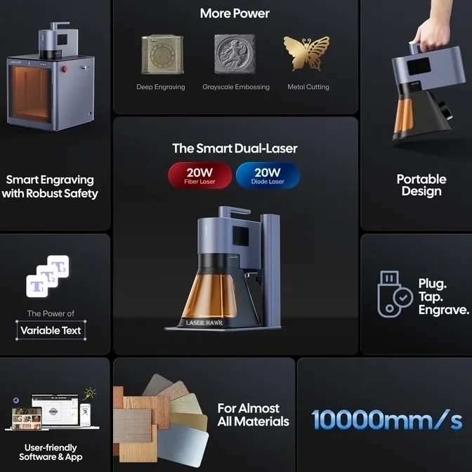 A laser engraving machine is a precision tool that uses focused laser beams to etch or cut materials. The Laserhawk LH5 exemplifies this technology, offering both cutting and engraving capabilities in one compact unit. This machine is ideal for various applications, from creating intricate designs on metals and plastics to producing detailed patterns on wood.