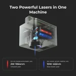 The IR laser (1064 nm) provides deep engraving on metals, while the DIODE laser (808 nm) is versatile for plastics and non-metallic materials.