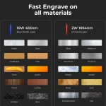 • Compatibility: The engraver supports various materials, including stainless steel, aluminum, titanium, acrylic, wood, and leather.