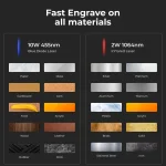 • Dual Laser Technology: The combination of IR and DIODE lasers allows for engraving on various materials, enhancing versatility.